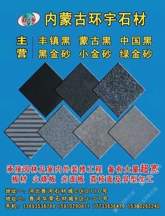 內(nèi)蒙古環(huán)宇石材,專營(yíng)各種黑色花崗巖。光面、火燒面、自然面、荔枝面、剁斧面。各種異形加工。工程以及家裝均可