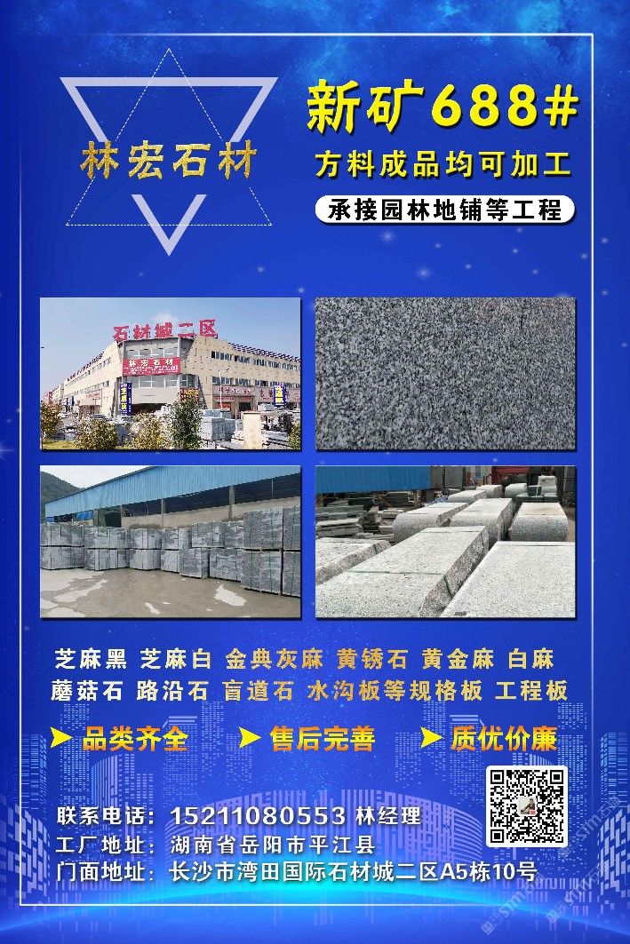 同等品質(zhì),價(jià)格更低-林宏石業(yè)林總152 1108 0553(微信同號)主營:新老礦芝麻黑654、芝麻灰655-688、芝麻白603、喬治亞灰641、黃金麻、黃銹石682、新礦福鼎黑、鐘山青、柬埔寨黑、長泰芝麻黑、廣西芝麻黑、山東芝麻黑、中灰麻、深灰麻等石材;湖南長沙長期配有大型堆場倉庫,廠礦一體,實(shí)力廠家;專注石材加工二十多年,工廠設(shè)備齊全,協(xié)作加工廠多,有實(shí)力承接大型工程;我們堅(jiān)持“高效率、優(yōu)質(zhì)量、超低價(jià)”,專業(yè)石材批發(fā)、園林路沿、幕墻干掛、墓碑加工、水池水景工程;歡迎廣大客戶來電咨詢、洽談合作!