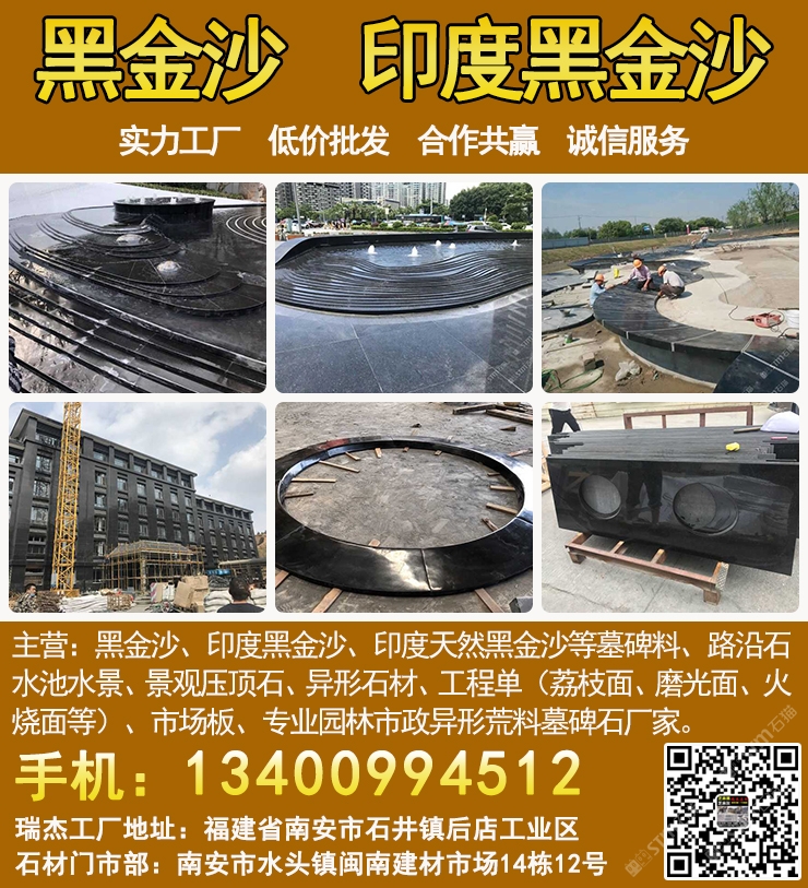 瑞杰黑金沙林總13400994512專業(yè)印度黑金沙供應(yīng)商,實(shí)力石材工廠主要加工:黑金沙、黑金砂、印度黑金沙、印度天然黑金沙、印度黑色石材、印度黑石、黑金沙石材、黑金沙花崗巖、新礦黑金砂、國產(chǎn)黑金沙、新黑金沙石材等墓碑料、路沿石、水池水景、景觀壓頂石、異形石材、工程單(荔枝面、磨光面、火燒面等)、市場板、專業(yè)園林市政異形荒料墓碑石廠家,實(shí)力工廠、低價批發(fā)、合作共贏、誠信服務(wù). 工廠地址:福建省南安市石井鎮(zhèn)后店工業(yè)區(qū),門市部:南安市水頭鎮(zhèn)閩南建材市場