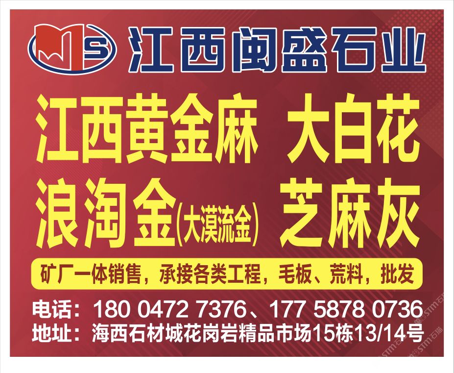 鑫山石業(yè)常年出售浪淘金(幻彩金麻),金絲麻,臺(tái)灣青,南非綠荒料,可根據(jù)客戶要求加工各種規(guī)格的薄板,延長(zhǎng)板,荔枝板,自然板,厚板,中長(zhǎng)板,工程板,光板,毛板,路沿石,樓梯踏步,色帶,廣場(chǎng)磚及自然面,荔枝面,噴砂面,火燒板等異型石材用于,高檔建筑室內(nèi)外墻面磚,地鋪石,路沿石,機(jī)拋石等,研發(fā)部門嚴(yán)把質(zhì)量關(guān),保證發(fā)貨期限,企業(yè)宗旨:“同等質(zhì)量比價(jià)格,同等價(jià)格比質(zhì)量”我廠尋求長(zhǎng)期合作伙伴,與您攜手共創(chuàng)財(cái)富明天!浪淘金,是河北的一種優(yōu)質(zhì)黃色花崗巖,無色差,光潔度高,是裝飾內(nèi)墻、外墻、吧臺(tái)的理想產(chǎn)品,大量出口歐洲,日韓,中東等地.歡迎新老客戶來電訂購(gòu),量大價(jià)格優(yōu)惠。咨詢熱線: