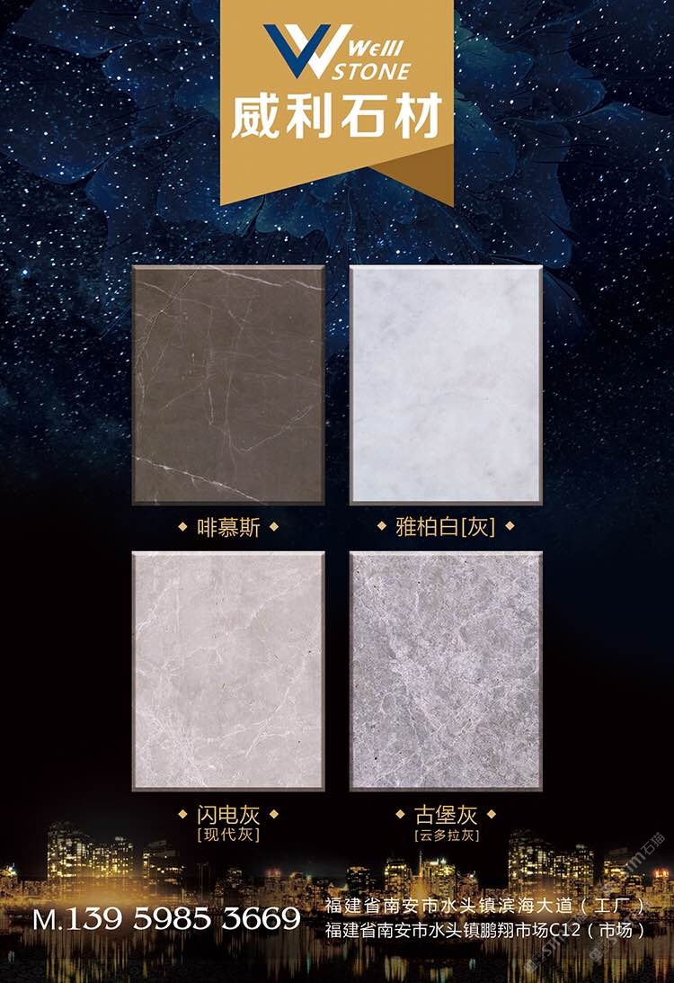 南安市威利石材有限公司成立于2008年,是一家集礦山開采、加工、銷售、工程設(shè)計施工、進出口貿(mào)易為一體的綜合型企業(yè)。我們不僅提供石材,更為您精心設(shè)計全套優(yōu)質(zhì)的石材解決方案。 威利石材專注于石材產(chǎn)品的礦山荒料直銷、大板加工、大板展銷、工程設(shè)計、工程配套施工服務(wù) 。公司主營啡慕斯、黑白根、塞浦路斯灰、古堡灰,愛馬仕灰(溫德姆灰),雅柏白,閃電灰多種優(yōu) 質(zhì)品種。公司已成為一家集專業(yè)化、產(chǎn)業(yè)化和規(guī)?;墓こ滩牧喜少?、加工配套服務(wù)商。 威利石材以自己多年專業(yè)化和國際化的經(jīng)營,與國內(nèi)外礦山建立了良好的商業(yè)信譽和經(jīng)貿(mào)合作關(guān) 系,贏得了國外礦山在中國區(qū)營銷戰(zhàn)略的全力支持。 威利石材依靠豐富的礦山資源,先進的管理、施工經(jīng)驗,堅持“以市場為導(dǎo)向、以技術(shù)為主體、 以質(zhì)量為命脈、以效益為中心”,大膽探索,在技術(shù)進步、生產(chǎn)經(jīng)營、企業(yè)管理、產(chǎn)品質(zhì)量、售后服務(wù)等 方面始終走在行業(yè)的前列。并在信守“質(zhì)量為準(zhǔn)、信譽優(yōu)等、服務(wù)為上”的企業(yè)精神指導(dǎo)下,產(chǎn)品暢銷世 界各地,深得消費者的信賴和贊譽。我們時刻把握時代脈搏,走在市場前沿,揮灑石材文化,增添人類輝煌。多年來我們一直致力于服務(wù)質(zhì)量的提高?!邦櫩蜑樯稀?、“追求圓滿”已經(jīng)融入到公司的企業(yè)文化、經(jīng)營 理念當(dāng)中,并且在產(chǎn)品生產(chǎn)、過程服務(wù)、售后追蹤等具體工作中得到落實。 我們的追求——集世界美石,為中國添彩!\ \ \ 地址:南安市水頭鎮(zhèn)濱海工業(yè)區(qū)\ 電話:13959853669\ 歡迎業(yè)務(wù)鏈接