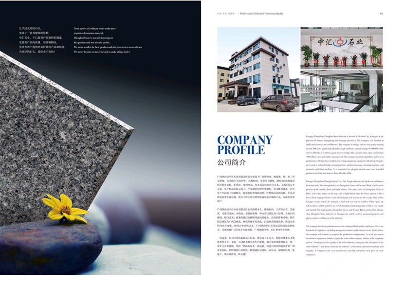 鐘山縣中匯石業(yè)有限責任公司坐落于廣西壯族自治區(qū)賀州市,地處湘、粵、桂三省交界地。公司創(chuàng)立于2019年,占地面積80余畝。企業(yè)實力雄厚,擁有300畝花崗巖礦區(qū)的開采權(quán),礦質(zhì)好、成材率高,年開采荒料10萬立方米,大板150萬平方米,年產(chǎn)值高達億元,產(chǎn)量穩(wěn)定實現(xiàn)連年增長。公司才能兼?zhèn)洌杂猩a(chǎn)車間,加工設(shè)備精良。配備有紅外線橋切機、紅外線自動切邊機、全自動磨光機、定厚機、仿形機、雕刻機等先進設(shè)備,致力于將天然石材塑造成形態(tài)美觀的產(chǎn)品,奉獻給社會各界用戶。