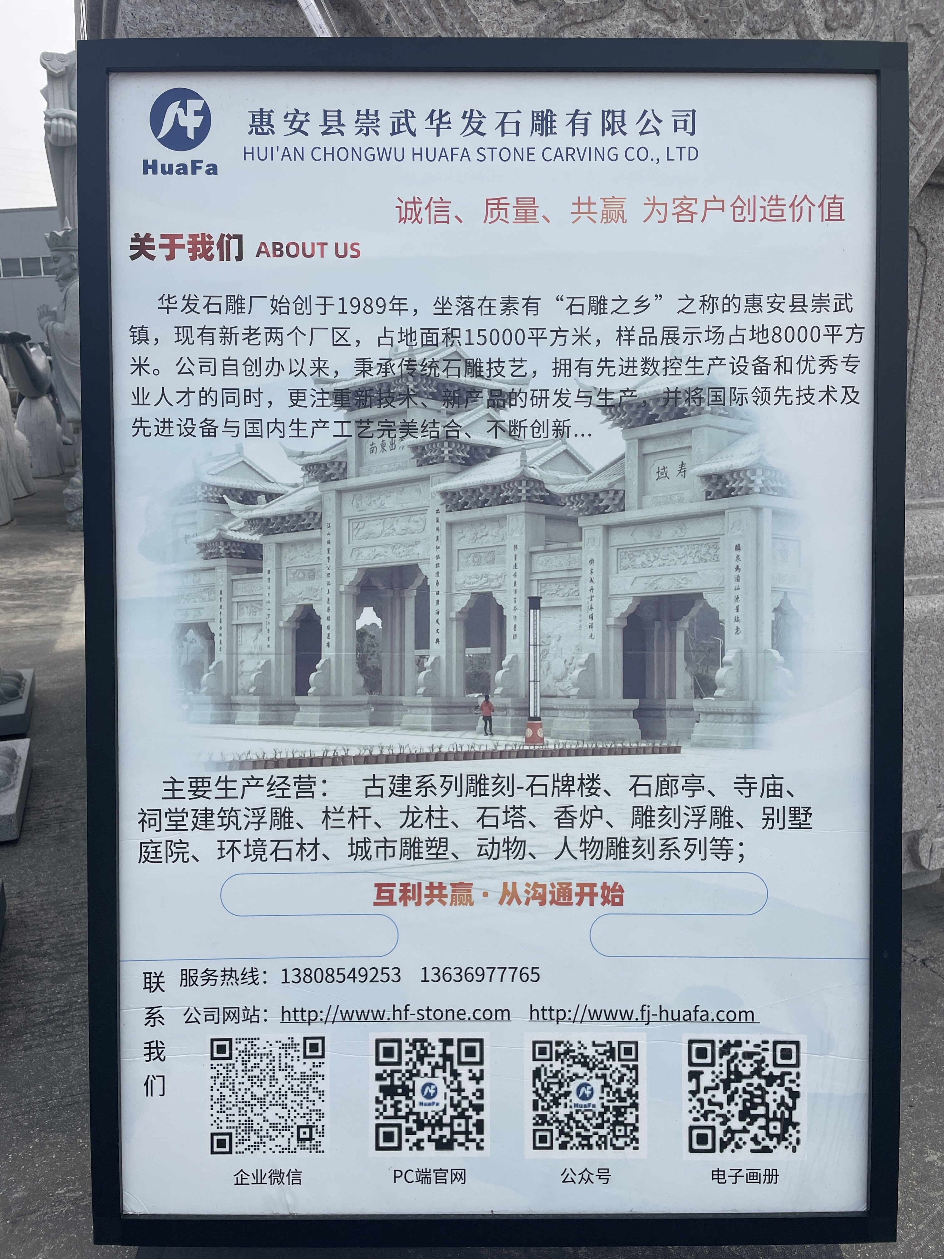 華發(fā)石雕廠始創(chuàng)于1989年,現有新老兩個廠區(qū),占地面積15000平方米,樣品展示場占地8000平方米。公司自創(chuàng)辦以來,秉承傳統(tǒng)石雕技藝,匯集了一批專業(yè)技術人才,企業(yè)實行科學的質量管理體系。