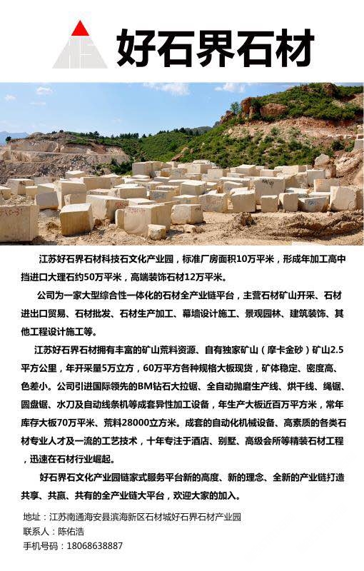 好石界石材科技江蘇有限公司 聯(lián)系人:黃先生    139****7333 查看 手機(jī)號(hào)碼:無(wú) 主營(yíng)范圍: 大板批發(fā)、異型加工、大理石加工、礦山、石材交易市場(chǎng)、 企業(yè)地址:上海嘉定區(qū)曹安公路4058號(hào)石博匯施恩德展廳