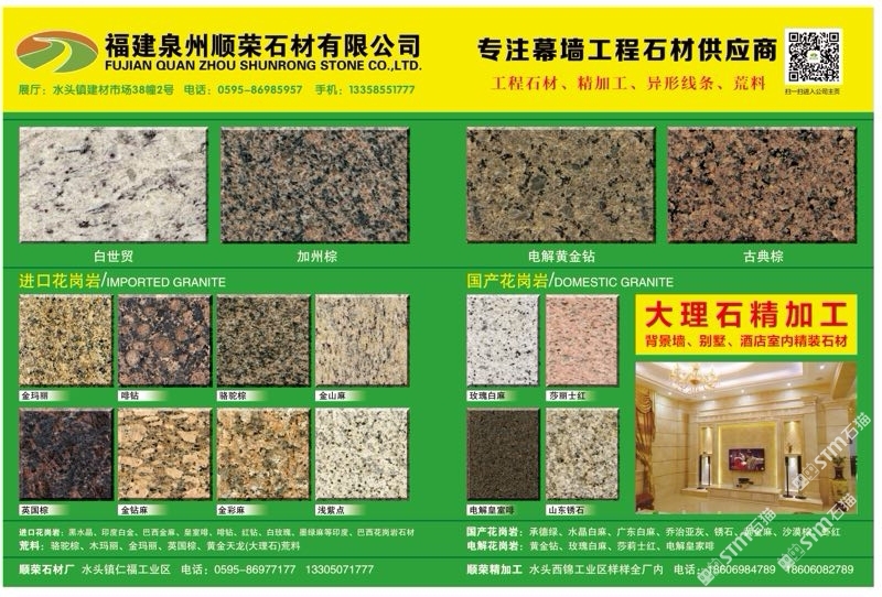 福建省泉州市順榮石材有限公司 聯(lián)系人:許先生    133****1777 查看 133****1777 查看 主營范圍: 花崗巖加工、礦山、荒料、大理石加工、石材工程資質(zhì)企業(yè)、石材雕刻、異型加工、水刀拼花、薄板復(fù)合板加工、大板批發(fā)、 企業(yè)地址:福建南安水頭鎮(zhèn)濱海大道中閩石材商城20-23號(中閩展廳)