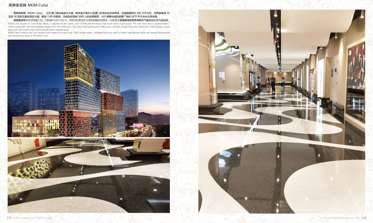 發(fā)布信息: 美獅美高梅(MGM Cotai),位于澳門(mén)路氹城金光大道, 毗鄰金沙城中心及澳門(mén)東亞運(yùn)動(dòng)會(huì)體育館,總樓面面積約200萬(wàn)平方尺,設(shè)兩座樓高30層及36層的五酒店大樓,提供1390間客房。設(shè)施包括容納2000人的動(dòng)感劇院,LED屏幕構(gòu)成的世博廣場(chǎng)和2870平方米會(huì)議場(chǎng)地等。 美獅美高梅采用鴻海精工石,面積達(dá)到7800方。鴻海石材高潔的光澤和細(xì)膩的紋理進(jìn)一步彰顯出美獅美高梅典雅的氣度和非凡的品位。