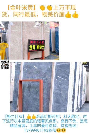 發(fā)布信息: 金葉米黃.新帝王 太空灰深藍(lán)淺藍(lán)底 新品:格蘭仕灰 價(jià)廉,物美 大量新貨.工程.家裝 銷售熱線:13799461192歐陽 地址:澳盛5B棟1區(qū)【華軒石業(yè)】