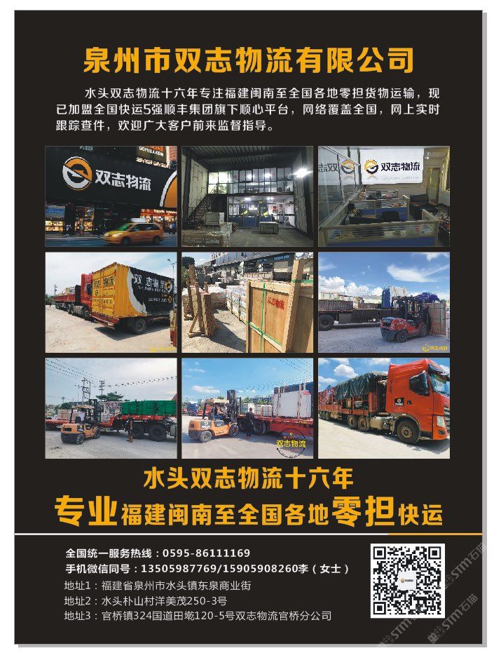 發(fā)布信息: ??【雙志物流】成立于2004年專業(yè)福建閩南至全國石材、瓷磚、巖板、背景墻、機械設(shè)備等零擔(dān)往返快運倉儲配送貨物運輸!大泉州地區(qū)同城一日達(dá)物流運輸,水頭、官橋、晉江三個倉儲中心打造大泉州同城智慧物流。歡迎廣大客戶監(jiān)督指導(dǎo)合作共享! 零擔(dān)天天發(fā)車,隨時可提貨!?????? 歡迎新老朋友來電咨詢 手機微信同號? 整車熱線:15905908260 零擔(dān)熱線:18314695339