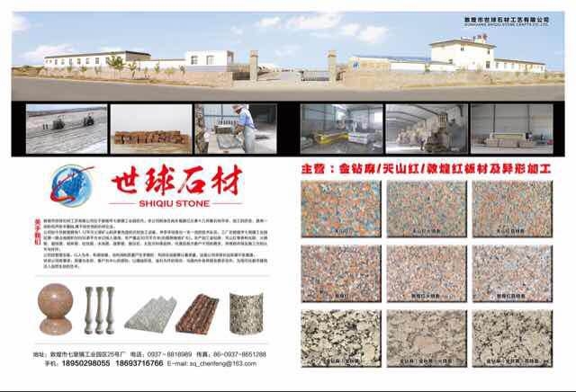 敦煌市世球工藝有限公司 聯(lián)系人:陳先生    187****9001 查看 189****8055 查看 主營范圍: 礦山、荒料、異型加工、花崗巖加工、石材工藝品、 企業(yè)地址:甘肅酒泉敦煌七里鎮(zhèn)工業(yè)園區(qū)25號廠