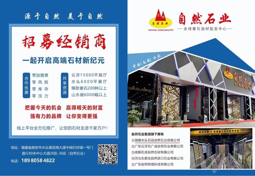 自然石業(yè)集團(tuán)成立于2003年,總投資4億元人民幣,是一家集石材產(chǎn)品研發(fā)、設(shè)計(jì)、礦山開(kāi)開(kāi)采、生產(chǎn)加工、銷(xiāo)售和專(zhuān)業(yè)承接工程于一體的大型企業(yè)集團(tuán)。旗下?lián)碛兴拇ǔ啥际勺匀皇挠邢薰?、河北石家莊自然進(jìn)口石業(yè)有有限公司、廣東云浮自然石業(yè)有限公司和福建水頭石品自然石業(yè)有限公司。福建水頭自然石業(yè)位于享譽(yù)全球的中國(guó)石材生產(chǎn)基地---南安市水頭鎮(zhèn)。水頭自然石業(yè)總投資1.5億元,展廳面積達(dá)六千平方米,分別設(shè)置天然山水畫(huà)專(zhuān)場(chǎng)館及奢石專(zhuān)場(chǎng)館。公司獨(dú)享多座大理石山水畫(huà)、奢石礦山資源,專(zhuān)注高質(zhì)量大理石山水畫(huà)及奢石的銷(xiāo)售。經(jīng)過(guò)不懈的努力,現(xiàn)已發(fā)展成為水頭鎮(zhèn)乃至福建省規(guī)模、品種全、價(jià)格惠的大理石山水畫(huà)、奢石批發(fā)中心!公司在發(fā)展中不斷完善組織機(jī)制,強(qiáng)化內(nèi)部管理和人員培訓(xùn)。立足現(xiàn)在,展望未來(lái),公司始終堅(jiān)持“追求無(wú)止境、與時(shí)俱進(jìn)創(chuàng)未來(lái)”的企業(yè)宗旨,以的產(chǎn)品,陽(yáng)光的態(tài)度,服務(wù)于廣大客戶(hù)朋友,歡迎新老客戶(hù)到實(shí)地考察、洽談合作!