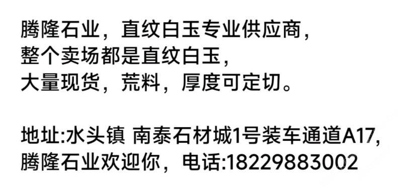 發(fā)布信息: 騰隆石業(yè),直紋白玉專業(yè)供應(yīng)商, 整個(gè)賣場(chǎng)都是直紋白玉, 大量現(xiàn)貨,荒料,厚度可定切。 地址:水頭鎮(zhèn) 南泰石材城1號(hào)裝車通道A17, 騰隆石業(yè)歡迎你,電話:李13599988860 周18229883002