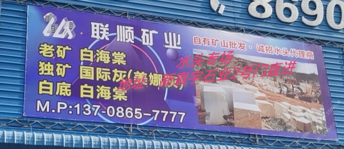 聯(lián)順礦業(yè) 聯(lián)系人:鄭先生    137****7777 查看 137****7777 查看 主營范圍: 礦山、荒料、大板批發(fā)、 企業(yè)地址:福建南安水頭鎮(zhèn)新寰宇石業(yè)2號門進,聯(lián)順礦業(yè)白海棠專場