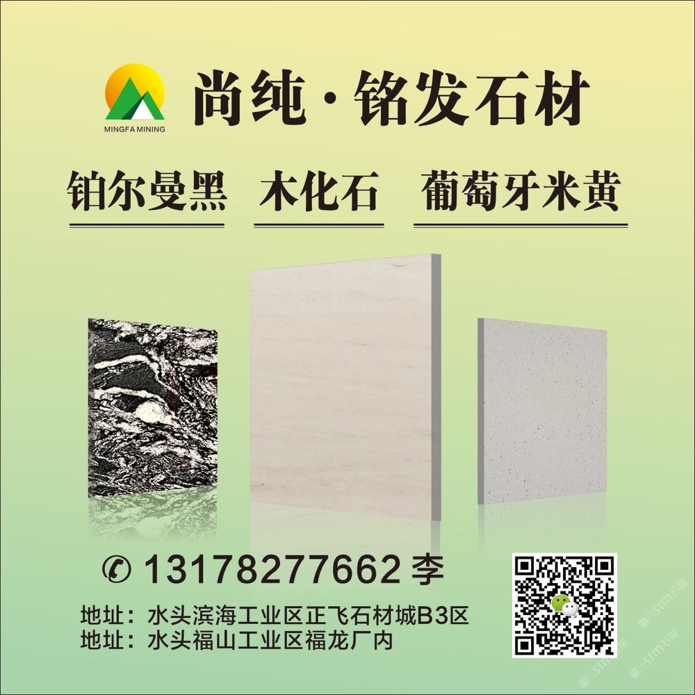 銘發(fā)石業(yè) 聯(lián)系人:李    131****7662 查看 131****7662 查看 主營范圍: 大板批發(fā)、荒料、 企業(yè)地址:福建泉州南安市水頭鎮(zhèn)濱海工業(yè)區(qū)正飛石材城B3區(qū)