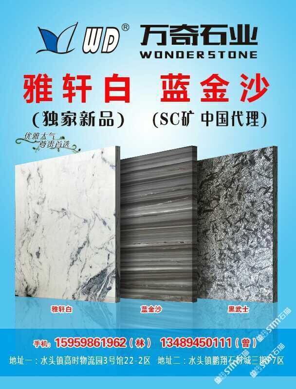 廈門萬奇石業(yè)有限公司 聯(lián)系人:林    139****0886 查看 136****3711 查看 主營范圍: 大板批發(fā)、荒料、大理石加工、石材外貿(mào)、 企業(yè)地址:福建泉州南安市水頭鎮(zhèn)海聯(lián)聯(lián)福大板市場6號(hào)門