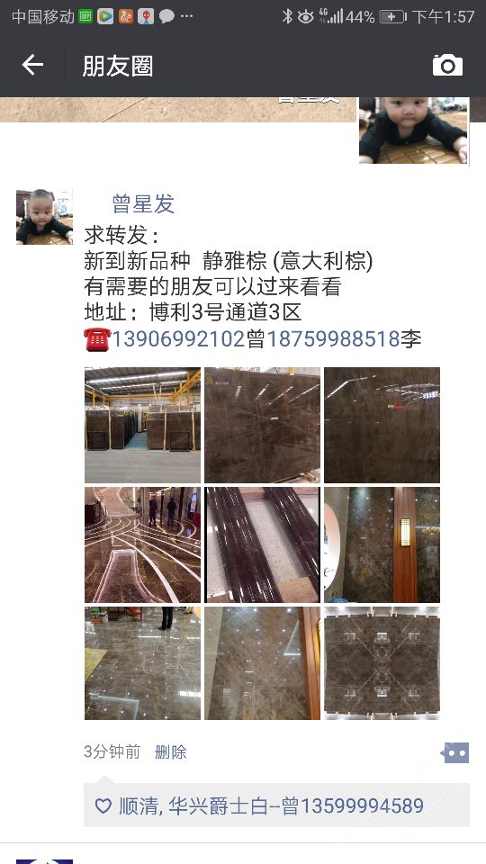 和順石業(yè) 聯(lián)系人:李先生    187****8518 查看 手機(jī)號碼:無 主營范圍: 大板批發(fā)、大理石加工、石材交易市場、荒料、 企業(yè)地址:福建泉州南安市水頭鎮(zhèn)正飛石材城11號進(jìn)來右手邊第一家C1